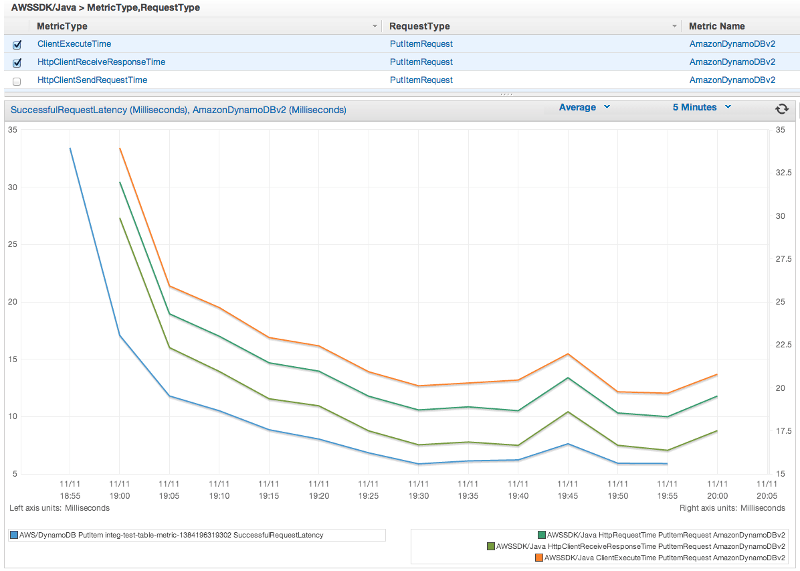 Once you enable the feature, every time there is a service request to AWS from the AWS SDK for Java, metric data points will be generated, queued for statistical summary, and uploaded asynchronously to CloudWatch about once every minute. Once metrics have been uploaded, you can visualize them using the AWS Management Console and set alarms on potential problems such as memory leakage, file descriptor leakage, and so on.